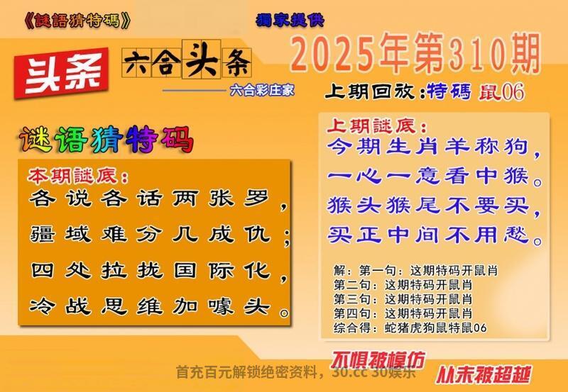 310期 各说各话两张罗 疆域难分几成仇 四处拉拢国际化 冷战思维加噱头 解译:四处拉拢国际化指04虎,冷战思维加噱头指战肖虎马狗牛 九肖:虎马狗牛龙蛇猪鼠兔 六肖:虎马狗牛龙蛇 三肖:虎马狗 一肖:虎 特码:16.28.24.36.20.32.17.29.14.26.13.25 |